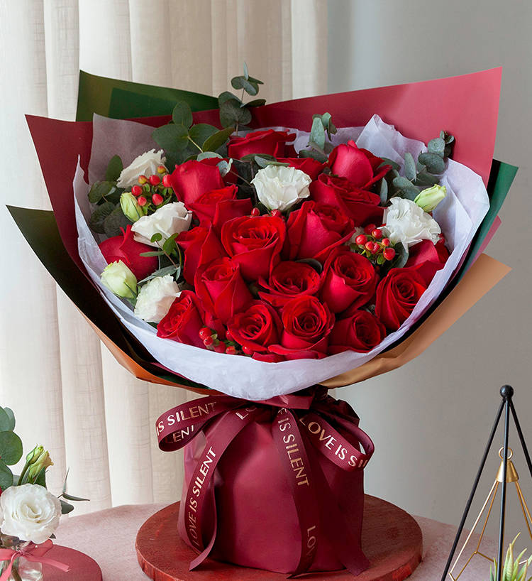 • 【19枝紅玫瑰,綠葉、滿天星 】 + 【德芙鐵盒心形巧克力(98克)】