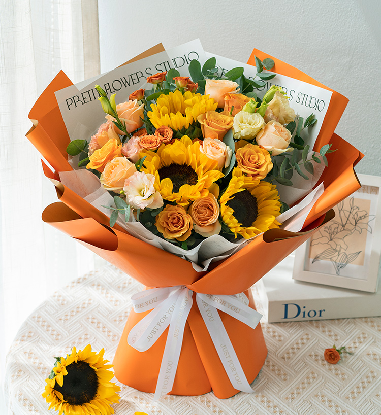 • 【19枝粉色扶郎,白色小菊間插,梔子葉間插】+【8寸鮮奶水果蛋糕】